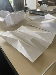 We began this exercise by experimenting with several folding patterns, aiming to find one that would allow for structural stability but also reasonable flexibility. We played with the scale of the folds as well as material and surface area of our paper. Eventually, we settled on a pattern of right-angled triangles, finding that this provided optimum stability and flexibility for our variations. We created six variations that continued the exploration of the void that we investigated in our previous exercise. Starting with the folded paper fully compressed for the first variation, we then began unfolding, expanding, and twisting to achieve more complex variations. Next, we attempted to further solidify the form by plastering one of the iterations. We observed the weighted effect the plaster and water had on the form, which resulted in a significant alteration and displacement of the folds, creating its own unique form.