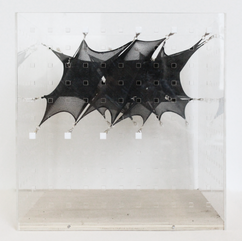 a 12x12x12in bounding box made of clear acrylic punctuated on each side with a 1x1in