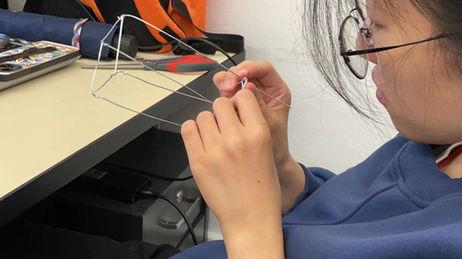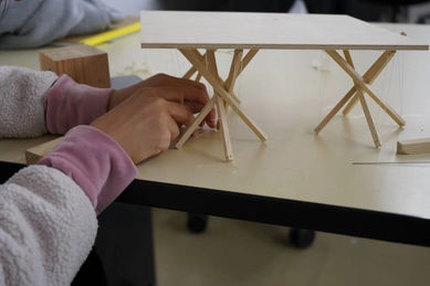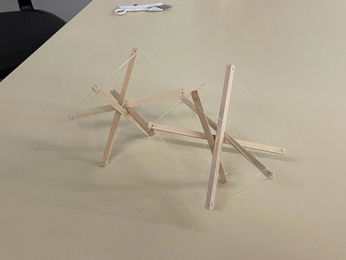 Our model features the assembling of reciprocal units whose sticks-line structures are based upon transegrity (tensile integrity). Each unit is built upon 4 identical wooden sticks forming a stand through compressing one another in the middle with 12 tied fishing line segments connecting the heads of each stick to frame a twisted cube. Continuous tensile force from lines act on the series of compression among sticks, reciprocally operating to construct a balanced, stable unit. Based on units, variations are created via connecting them, either through tension or compression from additional wires or through the compression between sticks against one another.