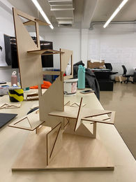 The model grows like a tree. Expansiveness is achieved by the strength discovered in linking wood pieces together in perpendicular fashion and alternating orientation between planar and vertical. While cohesion is maintained through the consistency of material and repetitiveness of modules, the interplay of orientation creates what we understand in the real world as floors and walls (arguably doors) and offers a function for the space.