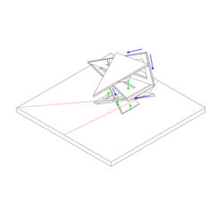 To create the reciprocal models, we wanted to explore the possibilities of the triangular pieces we used for the equilibrium model. We proportionally duplicated the original pieces and assigned them spatial qualities: vertical support elements such as walls or pillars with different angles of inclination, as well as horizontal elements such as platforms. To make balance possible, the pieces depend on each other. We interlock them together through slots at specific locations on the pieces (see detail), as well as tensioning threads 0.5 in. from each corner of the pieces, attached to the base.