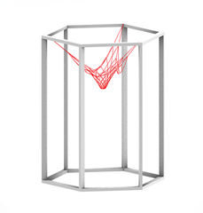 Our hanging model explored the structural potential of a macrame mesh hung within a hexagonal wooden frame. We investigated how different hanging conditions, defined by various anchor points, respond to applied loads. Testing three hanging conditions under loaded and unloaded states, we analyzed six variations in how the hand-knotted mesh stretched and draped into varied forms. A key aspect of our design is the macrame’s incremental pattern, following exponential growth, gradually increasing the density and complexity of the net.