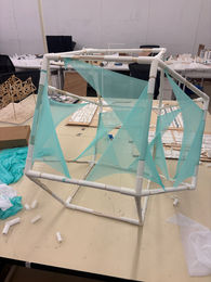 The model also reimagines fabric as an occupiable floor, supporting play or ecological functions like planting and drainage. Pinch points connect surfaces as circulation paths or water channels. Overall, tension produces efficient parabolic curves that demonstrate material use and force equilibrium.