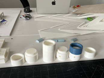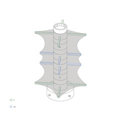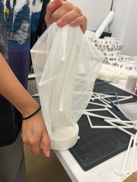 This membrane model investigates how tension, rotation, and compression can produce architectural form through a central vertical spine. Each vertebra-like plate rotates at fixed 45-degree increments through an internal cog system and receives sticks of two lengths, 3 inches and 2¼ inches. A stretched spandex membrane is pulled over the assembly, allowing the volume to emerge through a three-dimensional form-finding process.