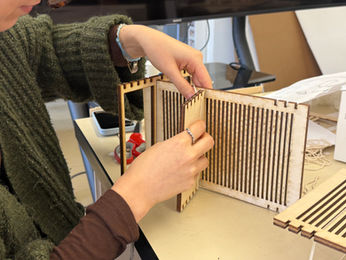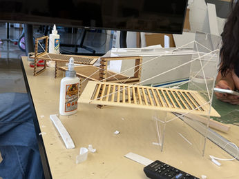 Building on our equilibrium model, we turned the seesaw idea into practical shading structures that use tension, compression, and simple notch joints. Previously, we tested an acrylic plane as a quiet support, tried a flexible rod in place of a rigid one, and used a recurring load with a brick. These tests taught us to treat weight as something we can tune. In this project we apply those lessons. We adjust span width, the stiffness of members, and the pull of the threads to control deflection and recover balance. When we use fewer columns, the threads must carry more of the work. When we add supports, the load path shortens and movement decreases. The notch details act as clear pivot points that let parts settle into equilibrium without metal fasteners. We also change the size and proportion of the shaded zones. Short and dense areas support quick passage. Long and low areas invite rest. Tall and open areas improve airflow. The result is a reversible and repairable system that uses modest material for strong effect. Each shade behaves like a seesaw, always negotiating forces, then coming to a stable and legible state that responds to site, sun, and use.