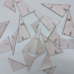 The process of making the Equilibrium model resulted in a design strategy of using minimal basswood as the sole component within a system whose load-bearing capacity far exceeded its own lightness. Taking this strategy further with the Reciprocal model, the structural concept of a dense mass erected upon a light-fibrous base inclined our design toward a water tank structure. Instead of iterating unique, individual bases which were dependent upon the set orientation of a specific object as we did prior, we sought a modular jointing system that could be arranged to accommodate masses of varying dimensions, weights, and orientations. The 30/60/90 and 45/45/90 triangles became the modular components because the horizontal, vertical, and diagonal edges inherently give each triangle a global stability.