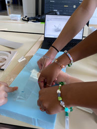 The model is a tensegrity system that explores the structural and aesthetic possibilities between three wood strips, a wood block, and wire. The intersections between wires create webs of tensile support for the mass, which subsequently exert compressive forces on the wood strips to create subtle curvatures. While the wires operate in a connected configuration, the wooden elements of the system remain strictly isolated from one another.